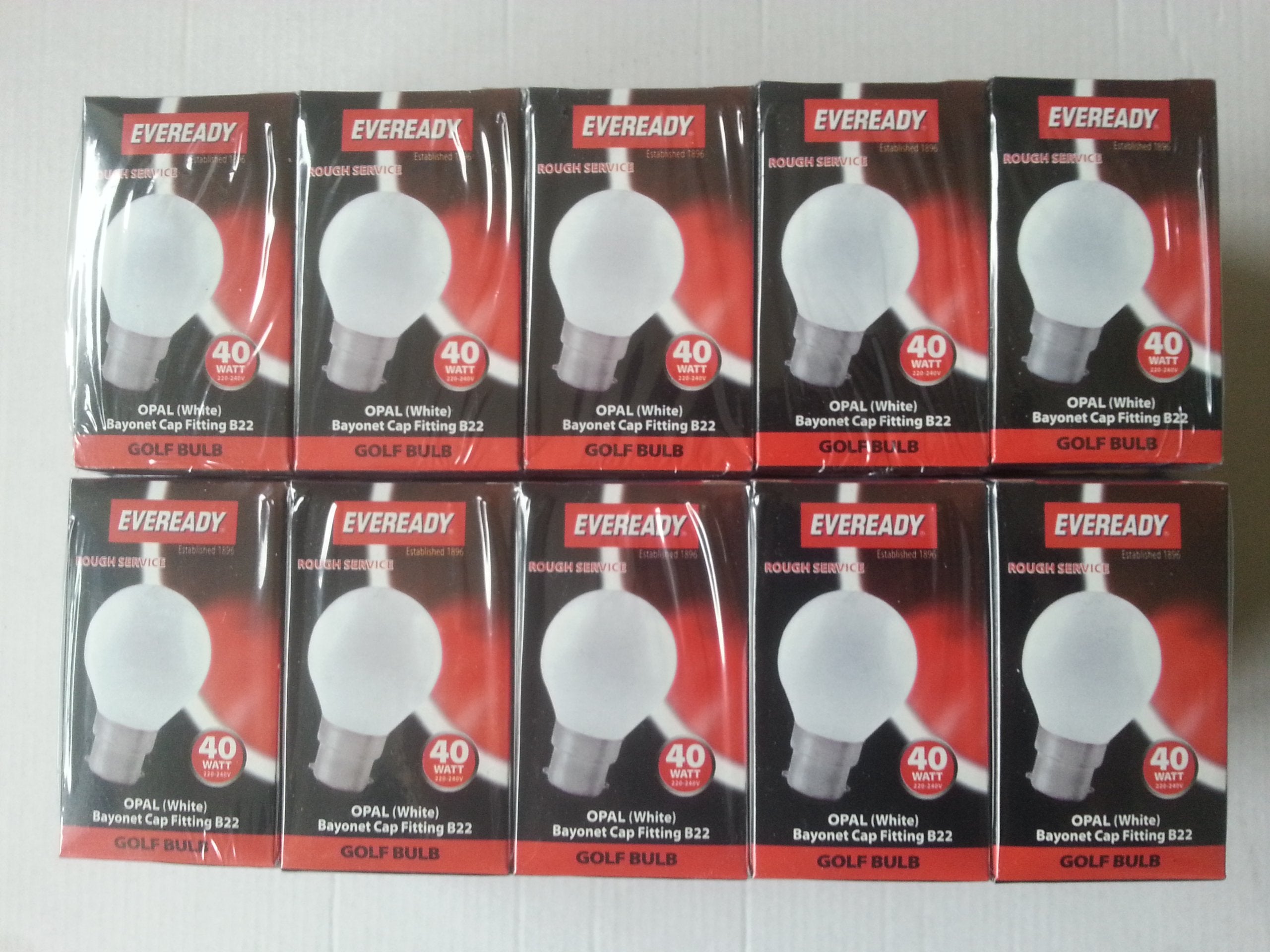 10 X 40 WATT GOLF BALL STANDARD BAYONET CAP (BC, B22) LIGHT BULBS. TOP BRAND
