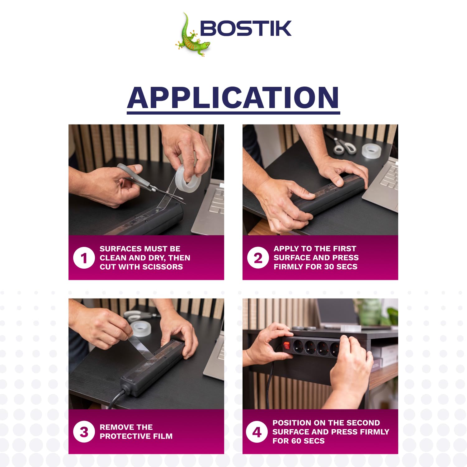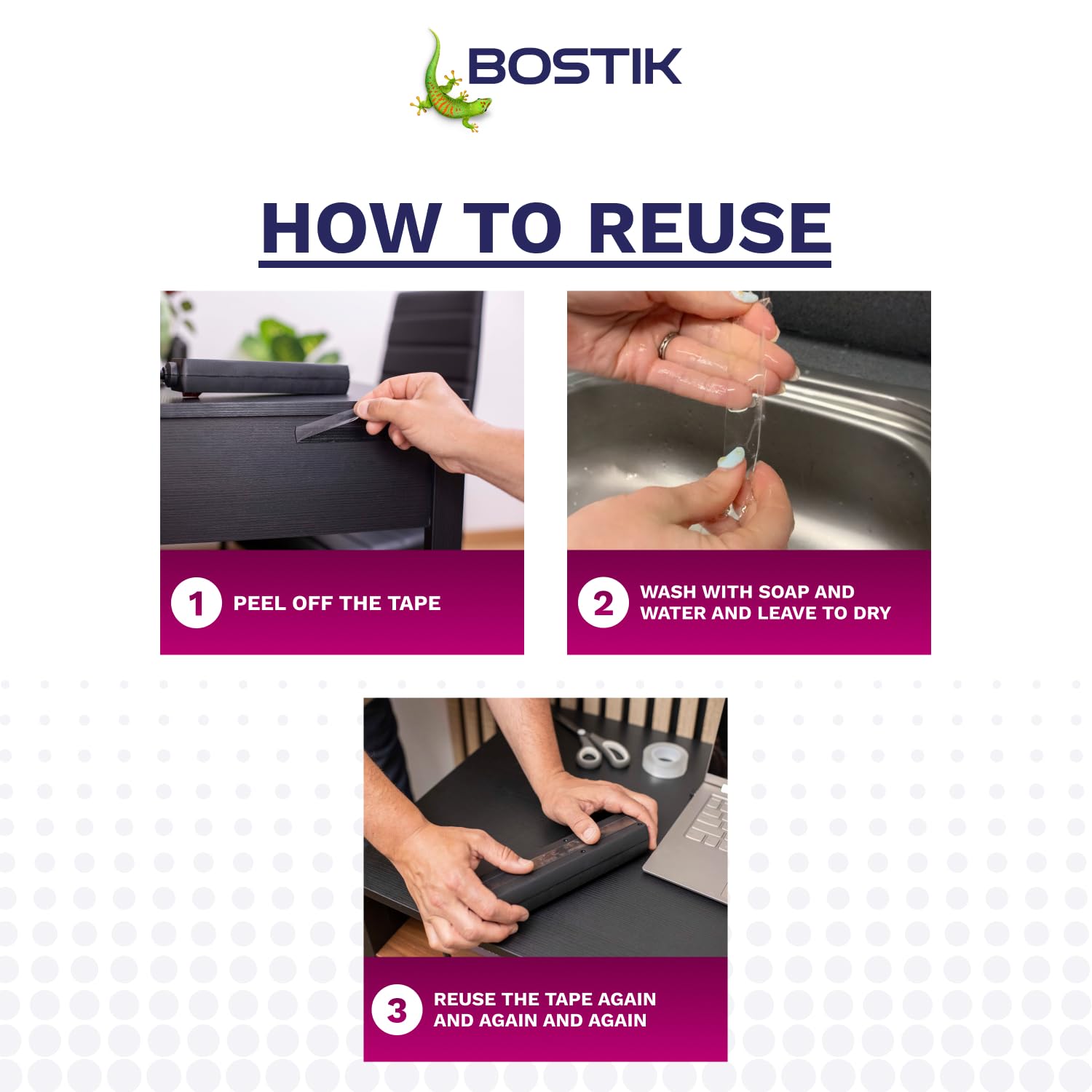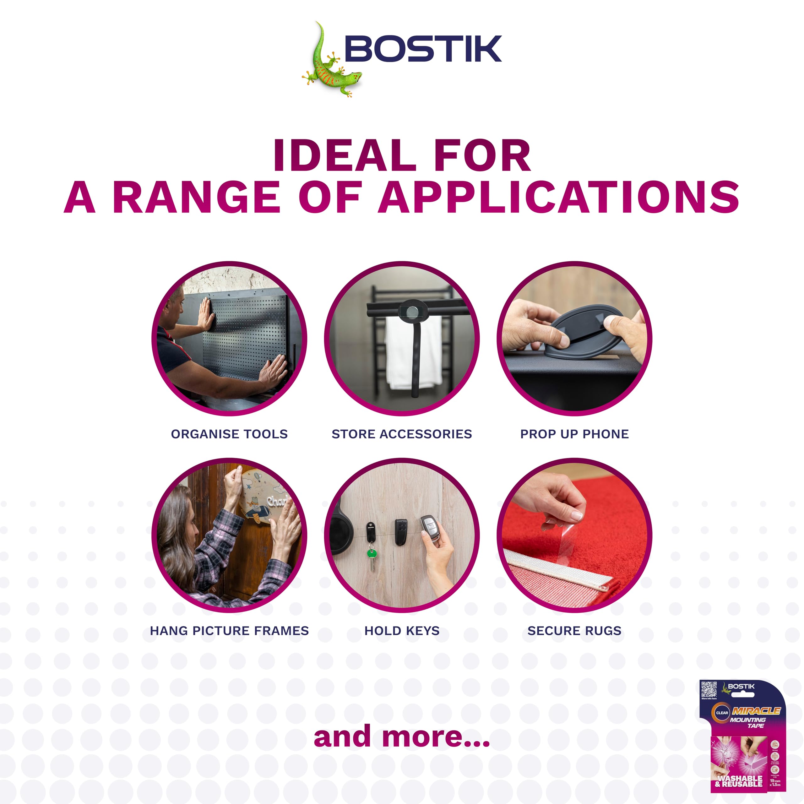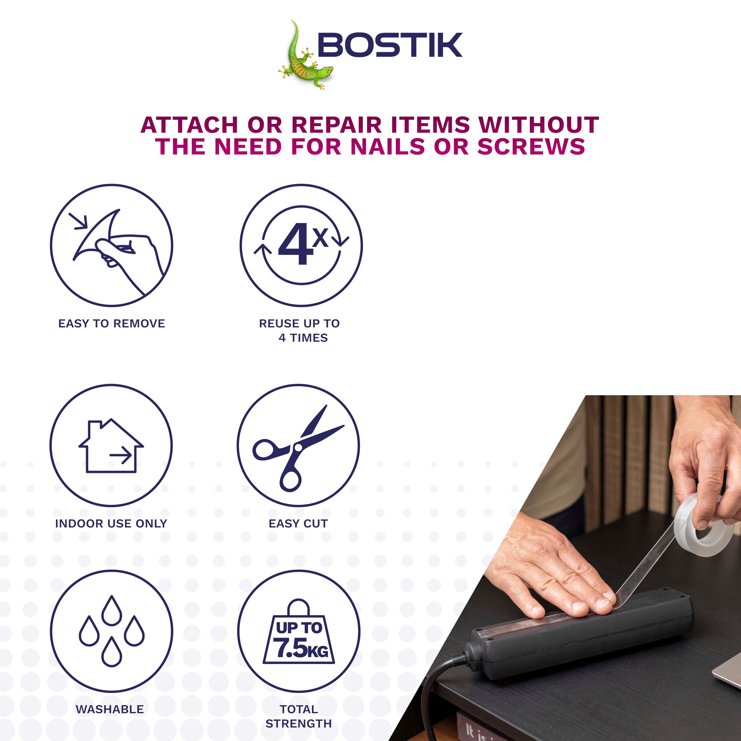 Bostik Miracle Mounting Tape Clear 19mm x 1.5m Roll - Double-Sided Mounting Tape - Ultra Strong - Washable & Reusable - 1kg per 20cm