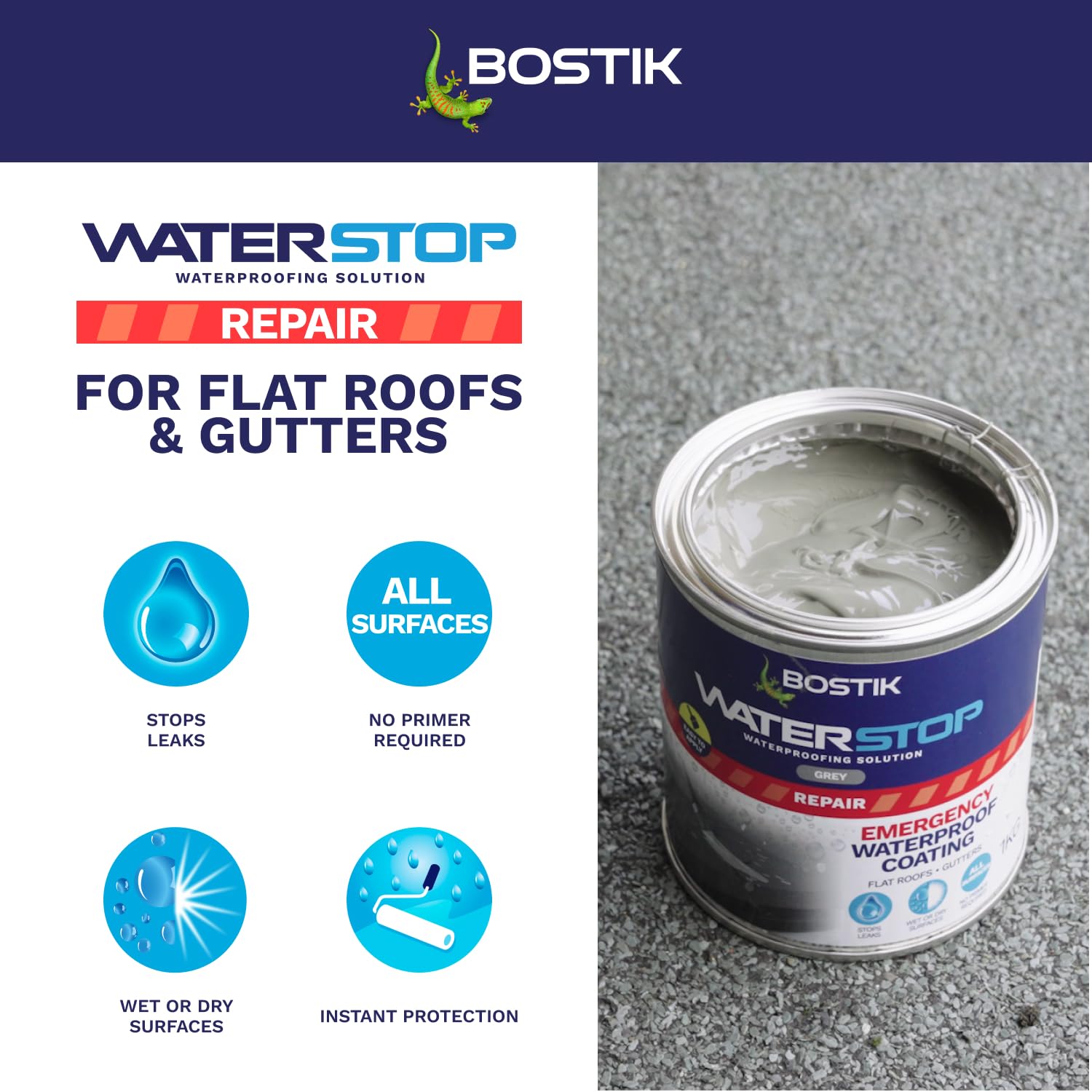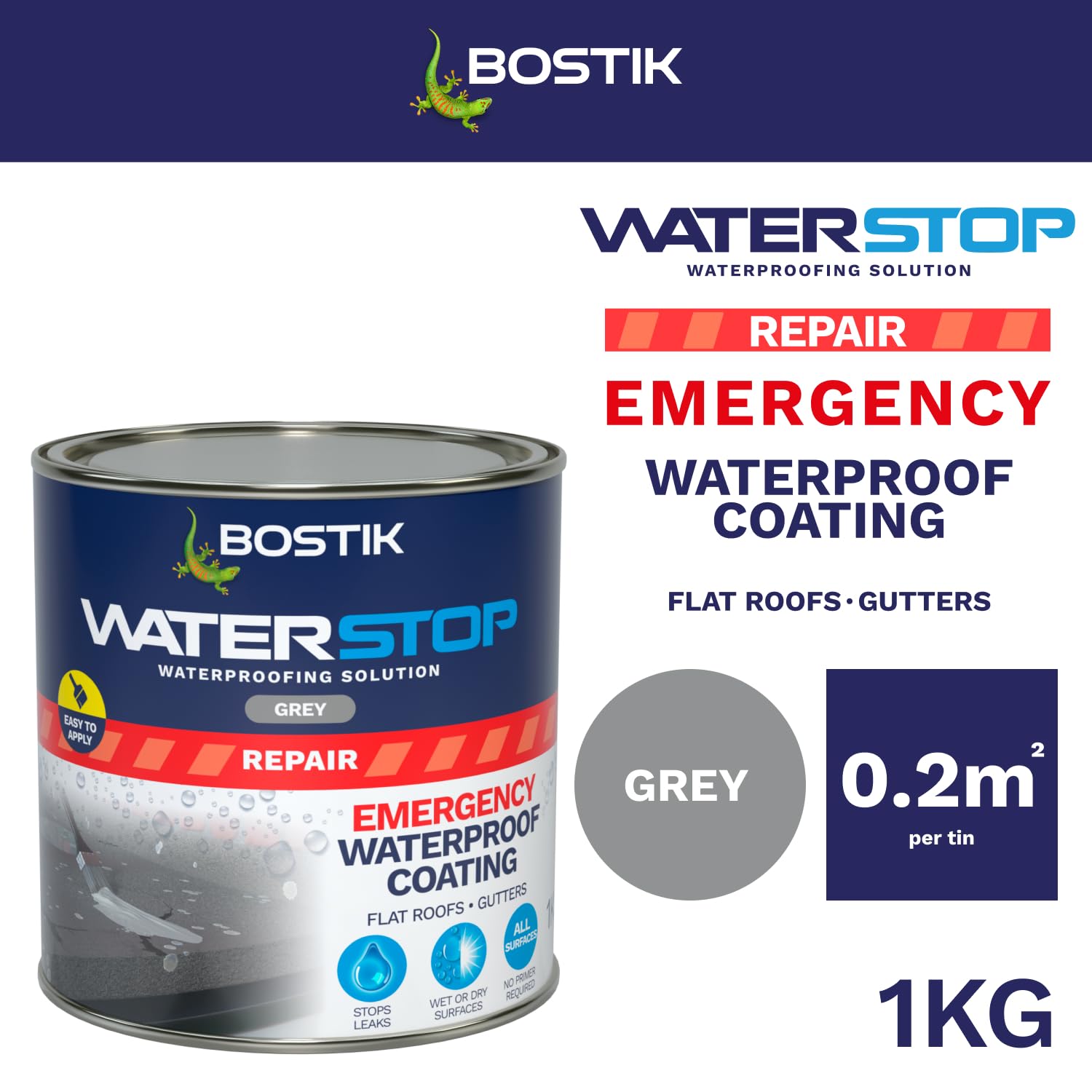 Bostik Waterstop Emergency Coat Grey - 1kg - Quick Drying - Instant Sealing Coating For Roofs And Gutters