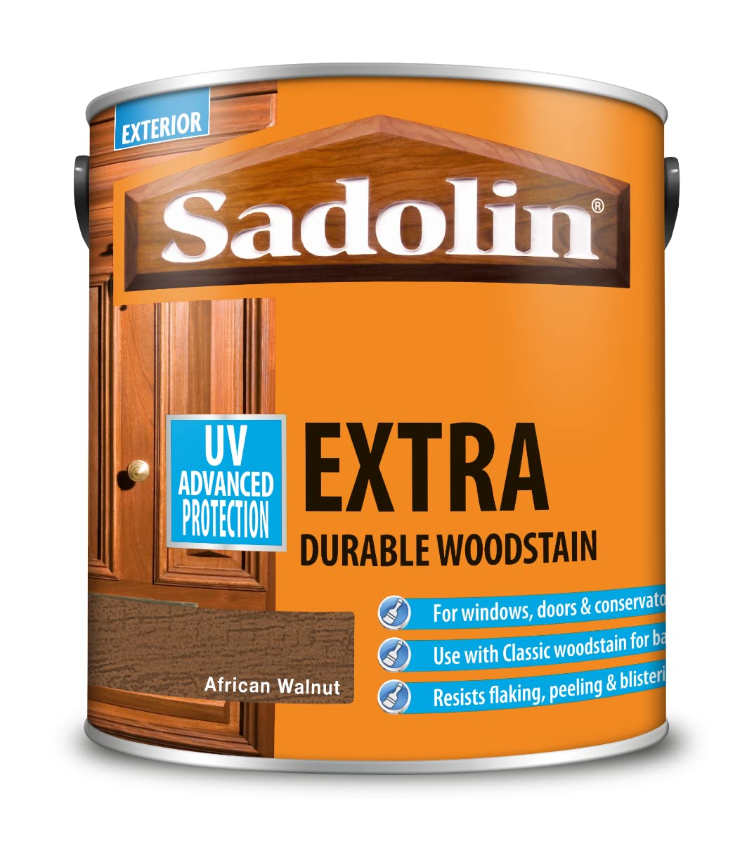 Sadolin Extra Durable Woodstain For windows, doors and conservatories Premium protection on new wood Resists flaking, peeling and blistering Durable and hard wearing DESCRIPTION Sadolin Extra is a durable woodstain for all softwood and hardwood apart from decking or areas subject to heavy wear/abrasion. It is particularly suitable for joinery such as doors and windows, where its flexible nature and water repellancy provide long lasting protection. For optimum durability on new wood, the use of Sadolin Classic as a base coat is recommended, particularly when treating hardwoods. ADDITIONAL INFORMATION No of Coats: 2 coats Drying Time: Touch Dry: 4 - 6 hours Re-coat: 16-24 hours Pack sizes available: 0.5 ltr 0.75 ltr 1 ltr 2.5 ltr 5 ltr Application: Apply by brush