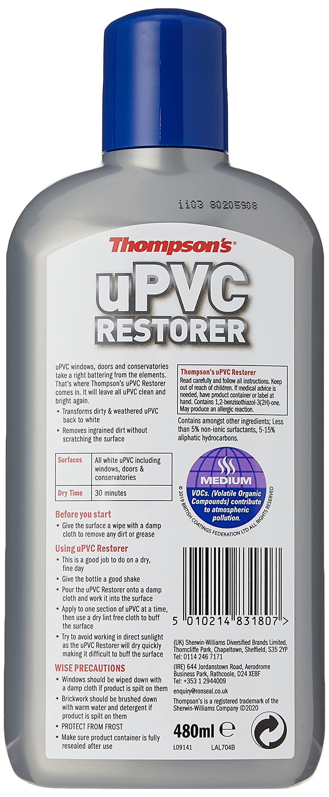 Thompsons UPVC Restorer 480ml VendorThompson's Water Seal Share WhatsApp Deel X Pin it Messenger Email Thompsons UPVC Restorer 480ml VendorThompson's Water Seal Share WhatsApp Deel X Pin it Messenger Email Product form Barcode: 5010214831807 Delivery within 48 hours Mid weeksMonday to friday we offer next day delivery if the product is on stock and exceptions on holidays.WeekendsWe offer no deliveries in the weekends.InternationalDepending on where you’re located, we offer next day delivery. Check your status on this link£16.80 Incl. VAT Quantity Add to cart This item is a recurring or deferred purchase. By continuing, I agree to the cancellation policy and authorize you to charge my payment method at the prices, frequency and dates listed on this page until my order is fulfilled or I cancel, if permitted.